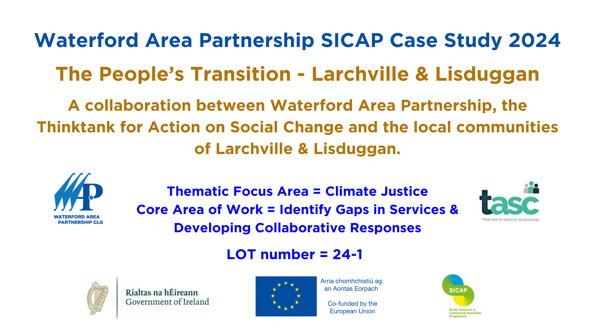 This Video Case Study, submitted as a SICAP requirement, describes The People’s Transition – Larchville & Lisduggan, a collaborative process with the Thinktank for Action on Social Change (TASC) and the residents groups of Larchville & Lisduggan. A community development approach to climate action supported local residents and community organisations to outline their vision for the future of the community within a just transition framework. The key themes of community greening for good mental health, retrofitting of homes to tackle fuel poverty, sustainable pathways to employment and inclusive active travel options are described and illustrated in the video as well as the outcomes of the ongoing project. Thank you to all those from the community that took part and the stakeholders / agencies who are supporting the progression of actions. Illustrations within the report and video by Robyn Deasy.